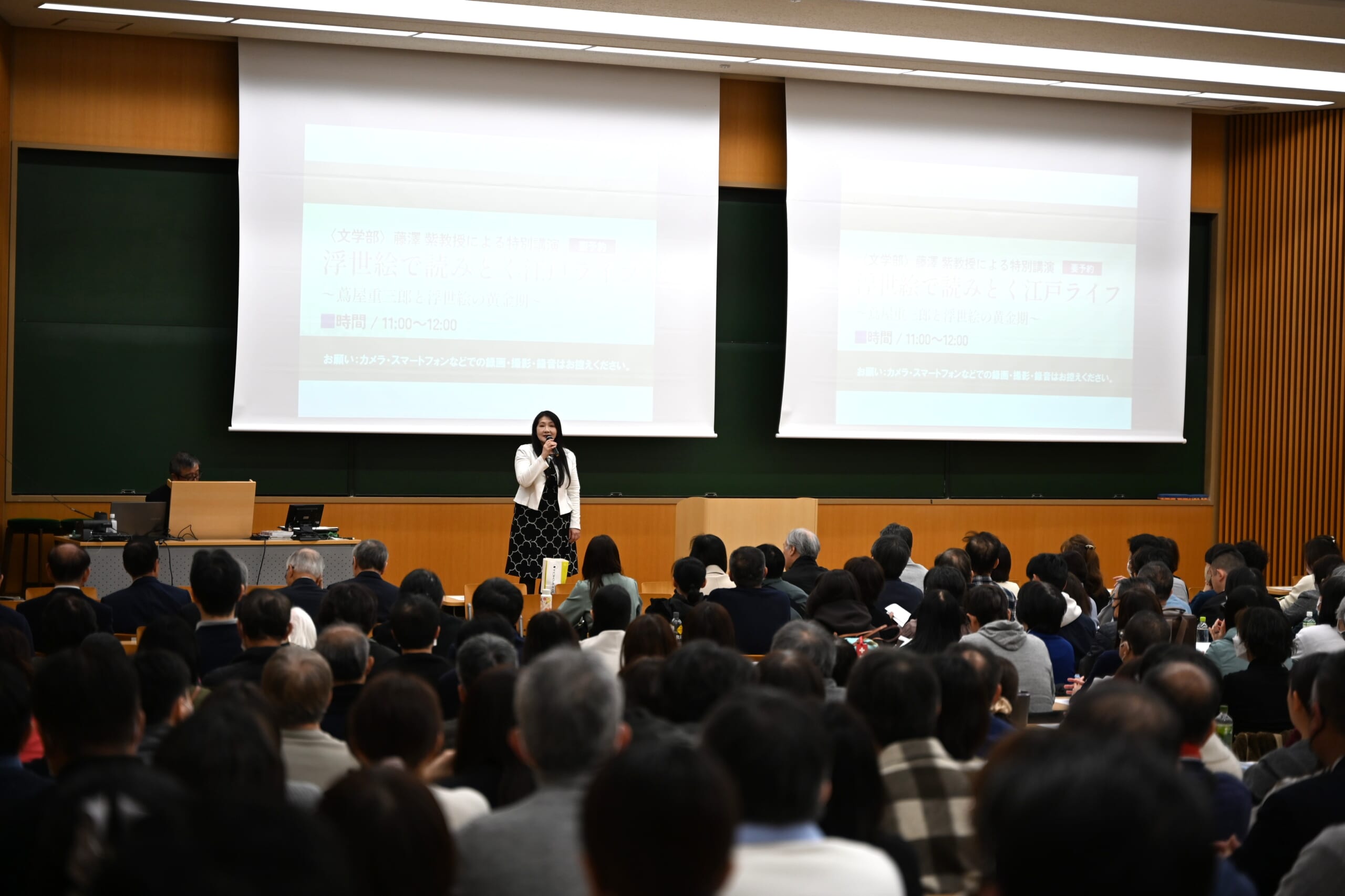 午前11時から、2104教室では開会セレモニーが行われ、針本正行学長と、卒業生の会である國學院大學院友会の吉田茂穂会長(73政・74神専攻/鶴岡八幡宮宮司)があいさつ。続いて、藤澤紫・文学部教授が「浮世絵で読みとく江戸ライフ〜蔦屋重三郎と浮世絵の黄金期〜」と題して特別講演を行いました。