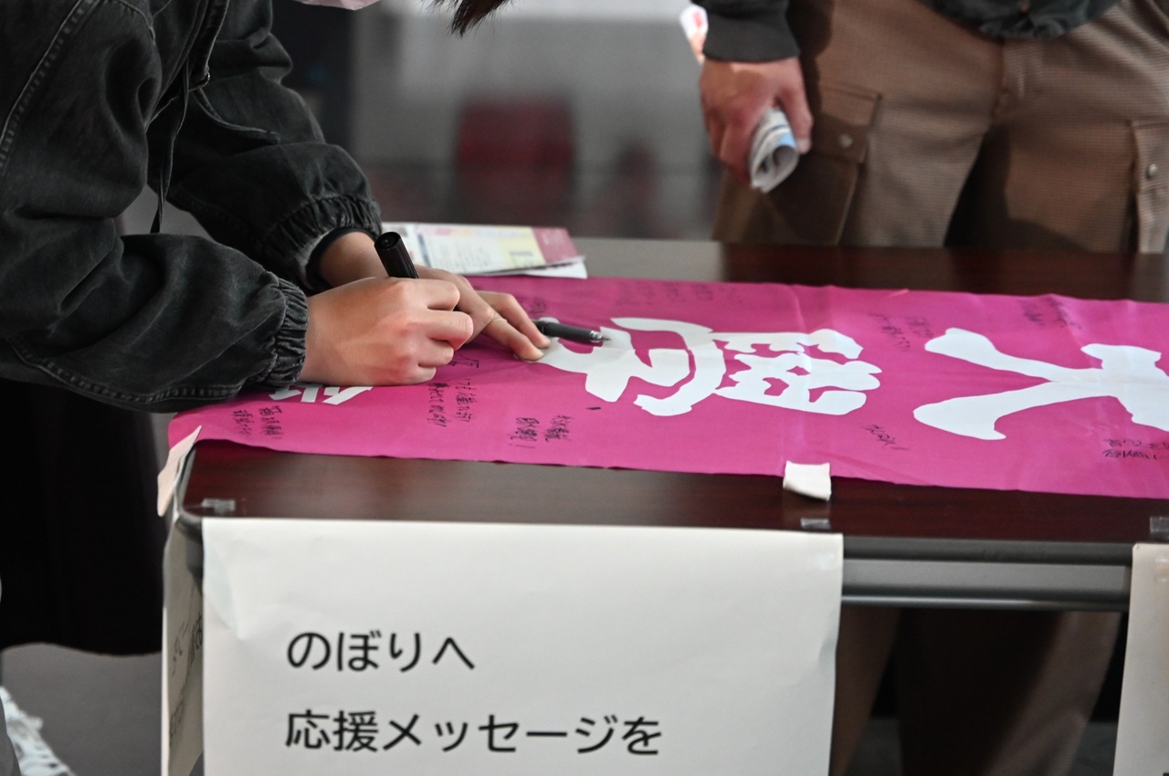 若木タワー1階では部会の応援ブースが設置され、硬式野球部、柔道部、陸上競技部のユニフォームが展示されたほか、箱根駅伝で実際に使用するのぼりに応援メッセージを書き込めるコーナーも設けられ、来場者から力強いメッセージが寄せられました。