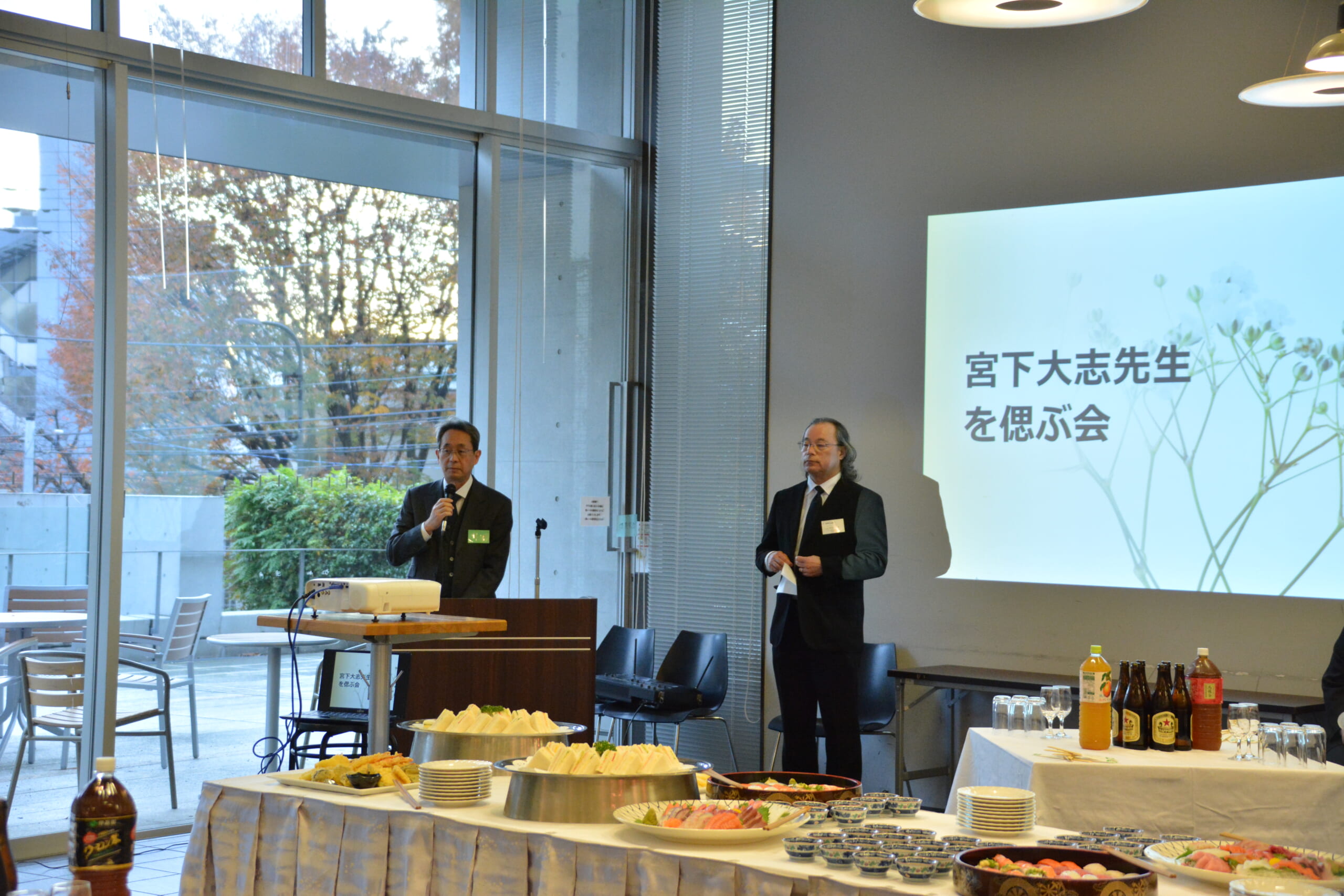 司会進行を務めた坂本一登・同教授より、宮下准教授の経歴について紹介された後、「宮下准教授が生前、宮下ゼミの学生たちを中心にお別れの会を実施したいと話されており、そのお気持ちに沿う形で本会を開くことになりました。皆さん、宮下准教授との思い出があると思いますが、それぞれの形でお別れをしていただければ幸いです」と会式の辞が述べられました。