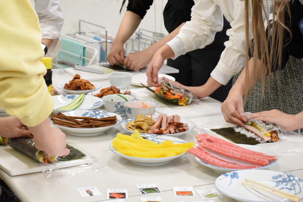 韓国からの留学生らが教えるキンパ作り体験が、令和7(2025)年12月1日に本学渋谷キャンパスの近くにあるリフレッシュ氷川で行われ、およそ10名の学生が参加しました。