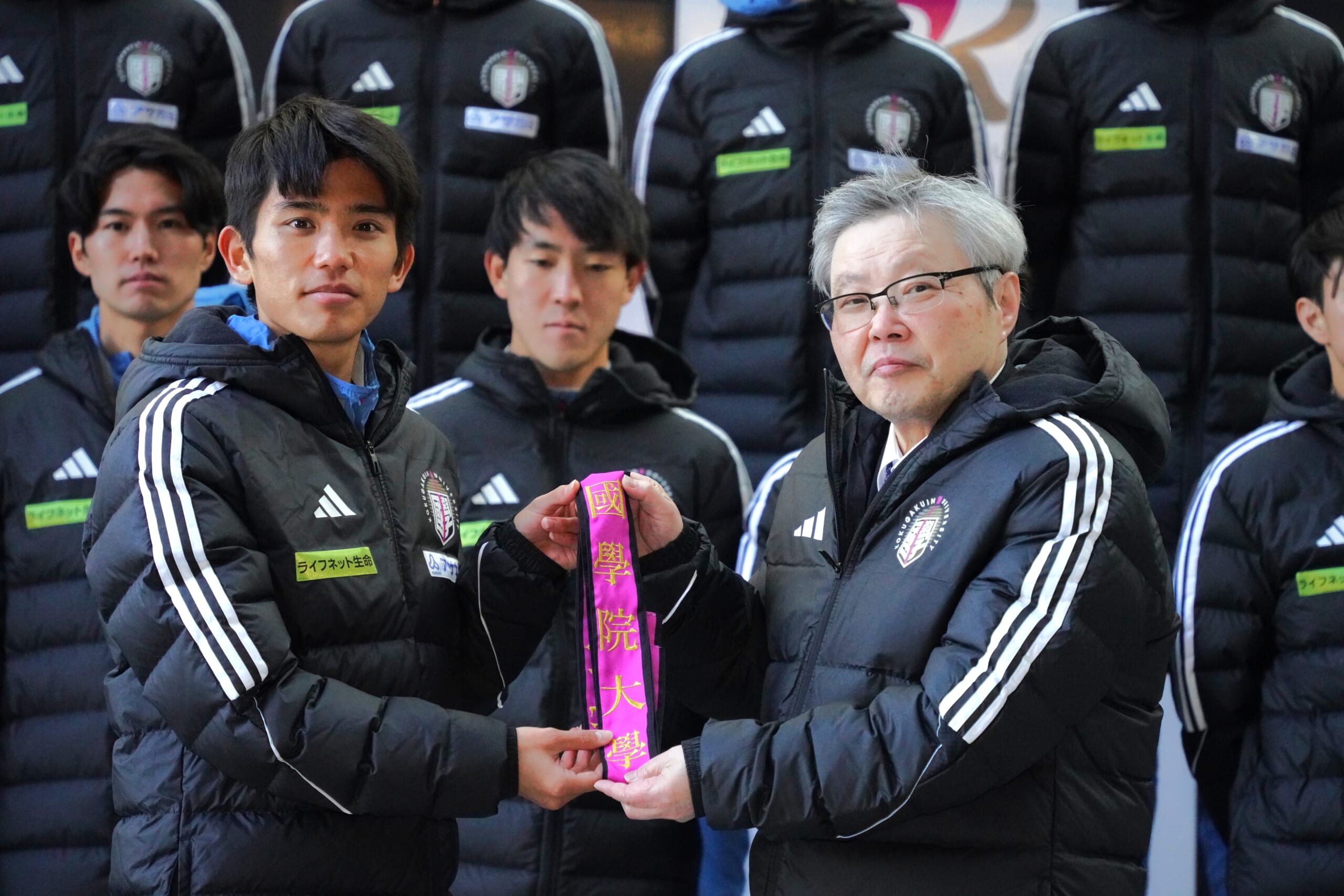 続いて針本学長から上原主将へ襷が授与され、参加者からは大きな歓声が送られていました。