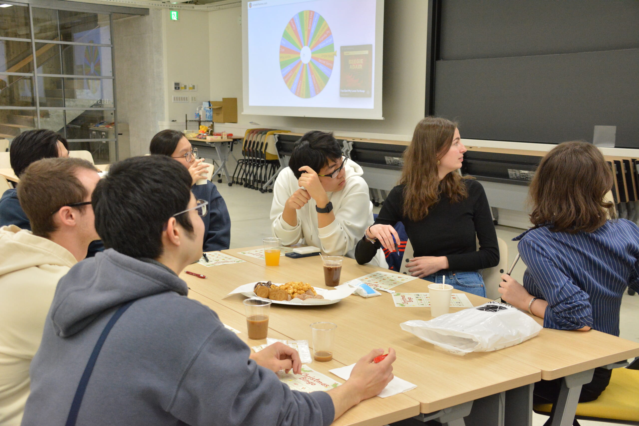 今回は、クリスマスパーティーとして、ビンゴ大会が行われ、、K-STEP科目等履修、学部留学生、大学院留学生と在学生ら約20人が参加しました。クリスマスに関するイラストが描かれたビンゴカードを片手にコミュニケーションをとるなど会場全体が盛り上がっていました。ビンゴ大会では景品も用意され、参加した学生たちは「欲しかった景品を取ることができてうれしかった」と感想を話してくれました。