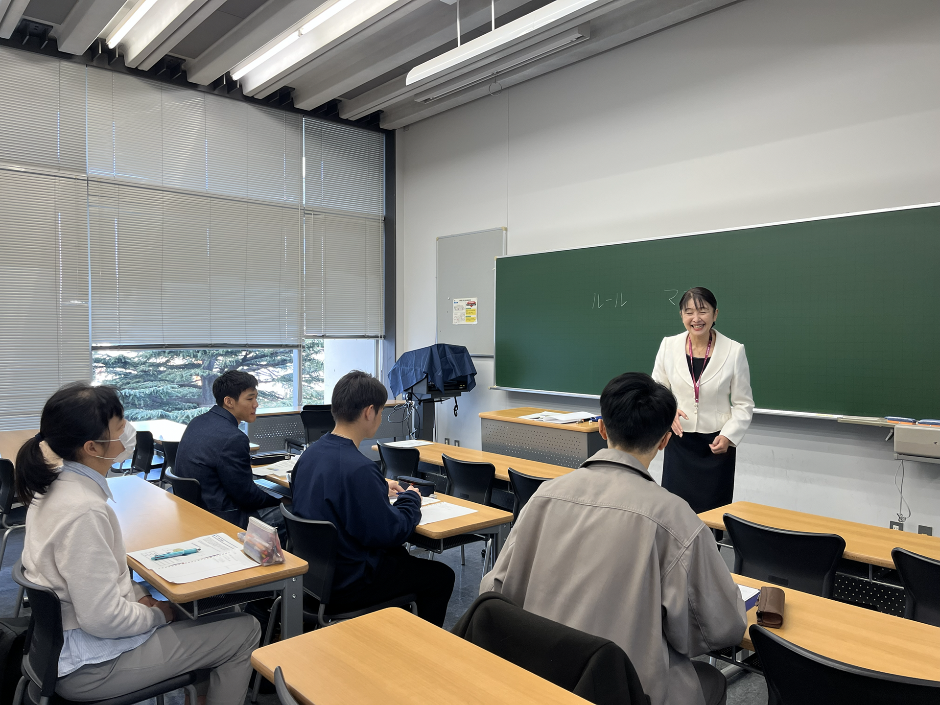 令和7年12月13日(土)2限の時間帯に渋谷キャンパス3号館3502教室にて、神道文化学部主催「マナー講座」を開講しました。講師として本学キャリアサポート課就職アドバイザーの竹内慶子先生をお招きし、ビジネスマナーの基本、挨拶、言葉遣いなど、座学と実践(実技)を織り交ぜながら指導いただきました。