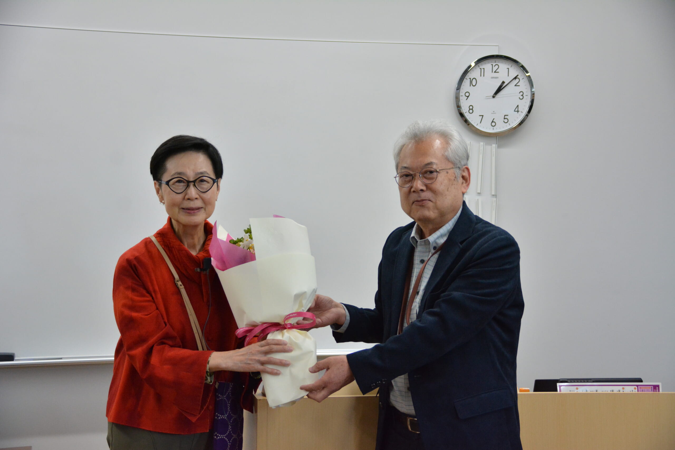 本日3限「地域と観光情報メディア」の講義前に、梅川智也・同副学部長(教授)から「楓教授には同学部の広報活動において非常に貢献していただきました。学部創立の準備期間を含めると、5、6年という長い間お疲れ様でした。感謝申し上げます。」と謝辞が述べられ、続けて花束の贈呈が行われました。