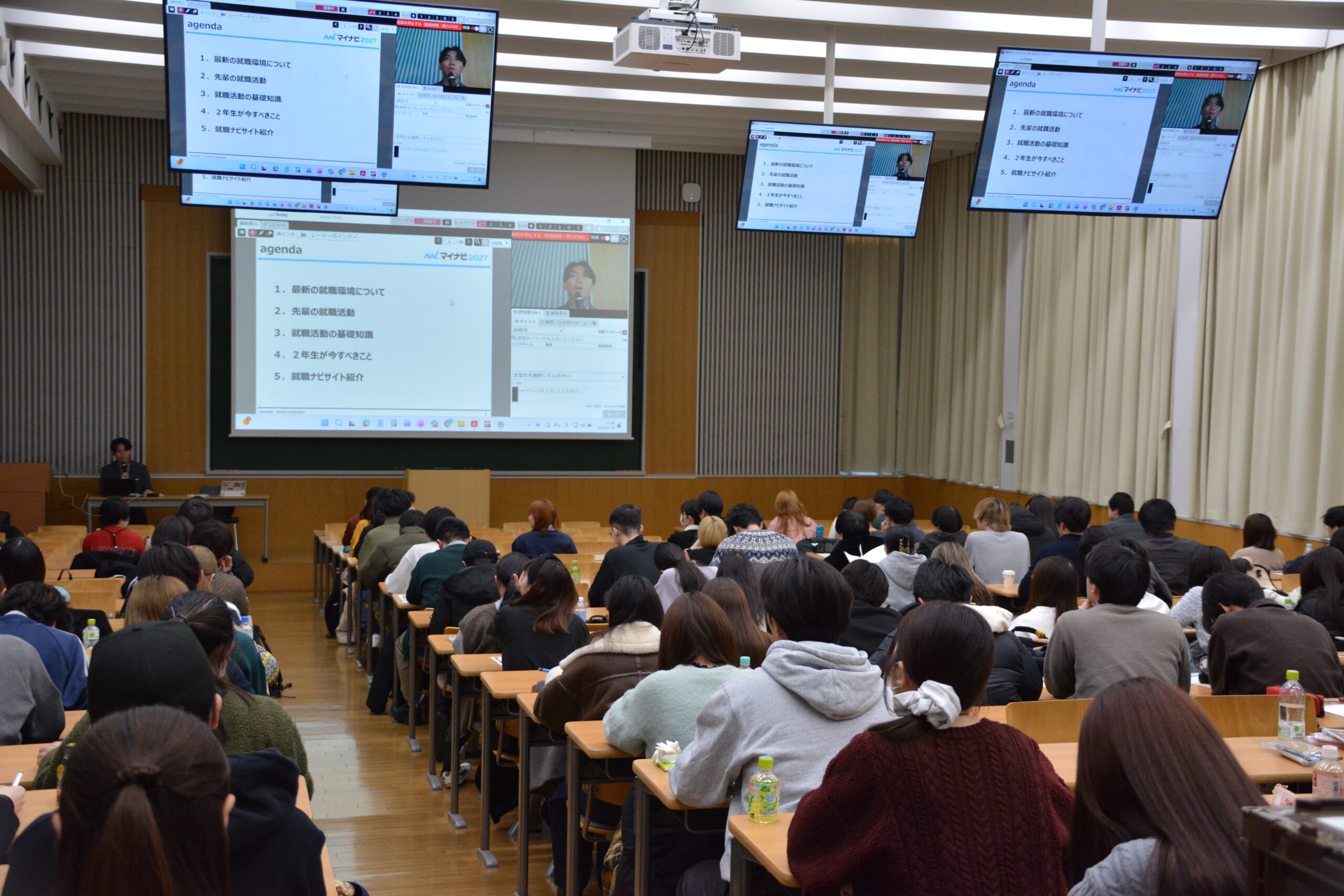株式会社マイナビの社員の方と本学キャリアサポート課の職員より、就職活動の現状と今後の就活活動の流れについて説明がなされました。ナビサイトの使い方や仕事選びのポイントなどの説明を受けた学生たちは熱心にメモを取りながら参加していました。