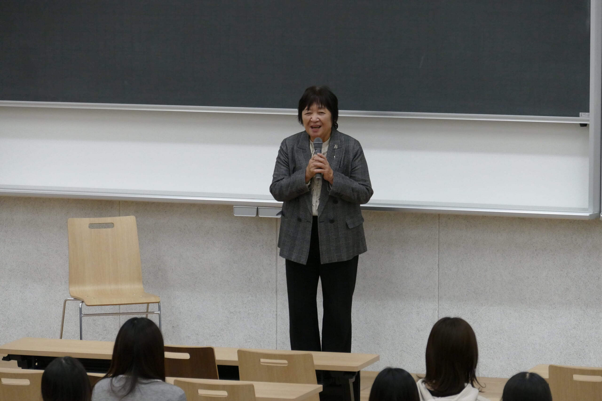 小笠原教授は小学校教員時代について話し、「本学学生は、教え込まれたことではなく、自分たちで考え、対話し、主体的に学ぶ力を持っています。これから先、困難なこともあるかと思いますが、仲間を頼り、自分の興味を持ったことに挑戦し続けてください。その自信を持った姿は、必ず子供たちに良い影響を与えます」と学生たちへ激励のメッセージを送りました。