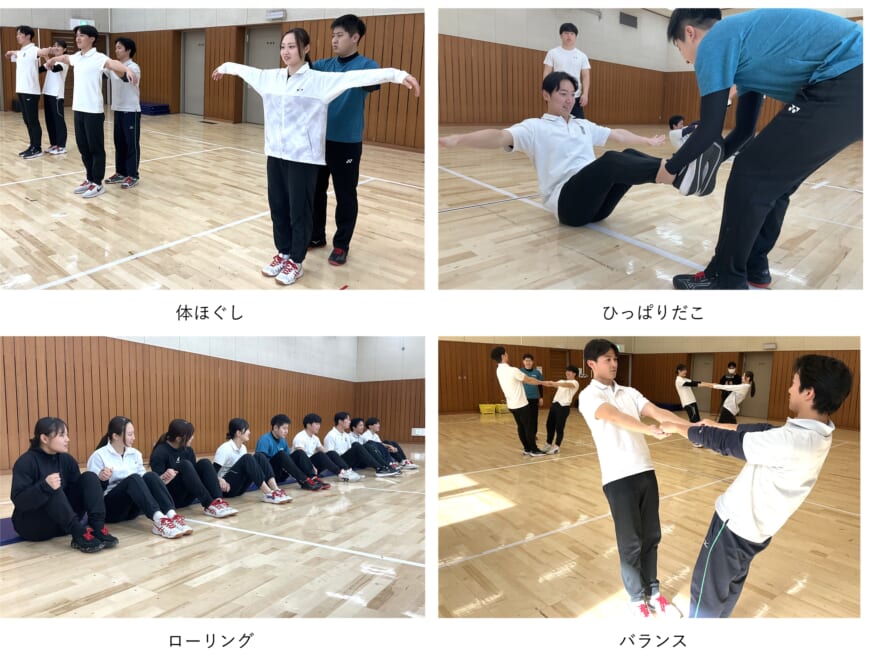 大矢ゼミ3、4年生および健康体育学科の有志が撮影モデルとして協力し、子どもたちが楽しく取り組める「体つくり運動」のさまざまな動きを撮影していました。学生の皆さんは、大学で学んだ理論やインターンシップ・教育実習での経験をしっかりと生かし、明るくのびのびと活動していました。