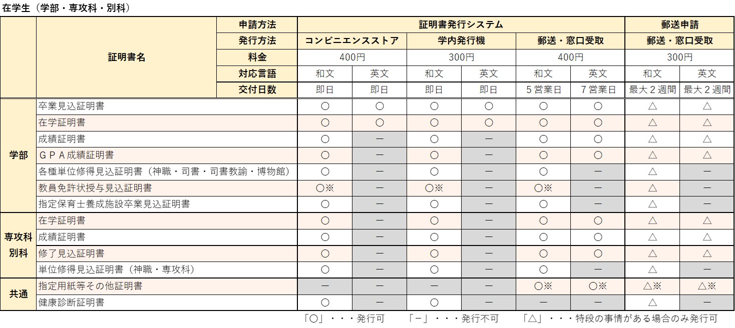 ※「教職免許状授与見込証明書」については、後期履修登録時点で取得見込み判定されている学生のみ、即日発行となります。(それ以外の方は、教務課・たまプラーザ事務課の窓口にご相談ください)