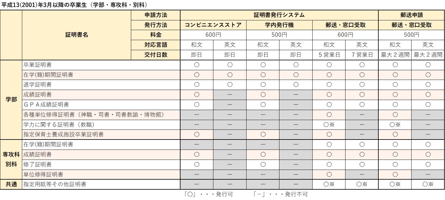 平成12年度以降卒業生(平成13年3月卒業)・退学者の和文の成績証明書、卒業証明書、退学証明書、在学期間証明書は証明書発行システムで、即日発行が可能です。